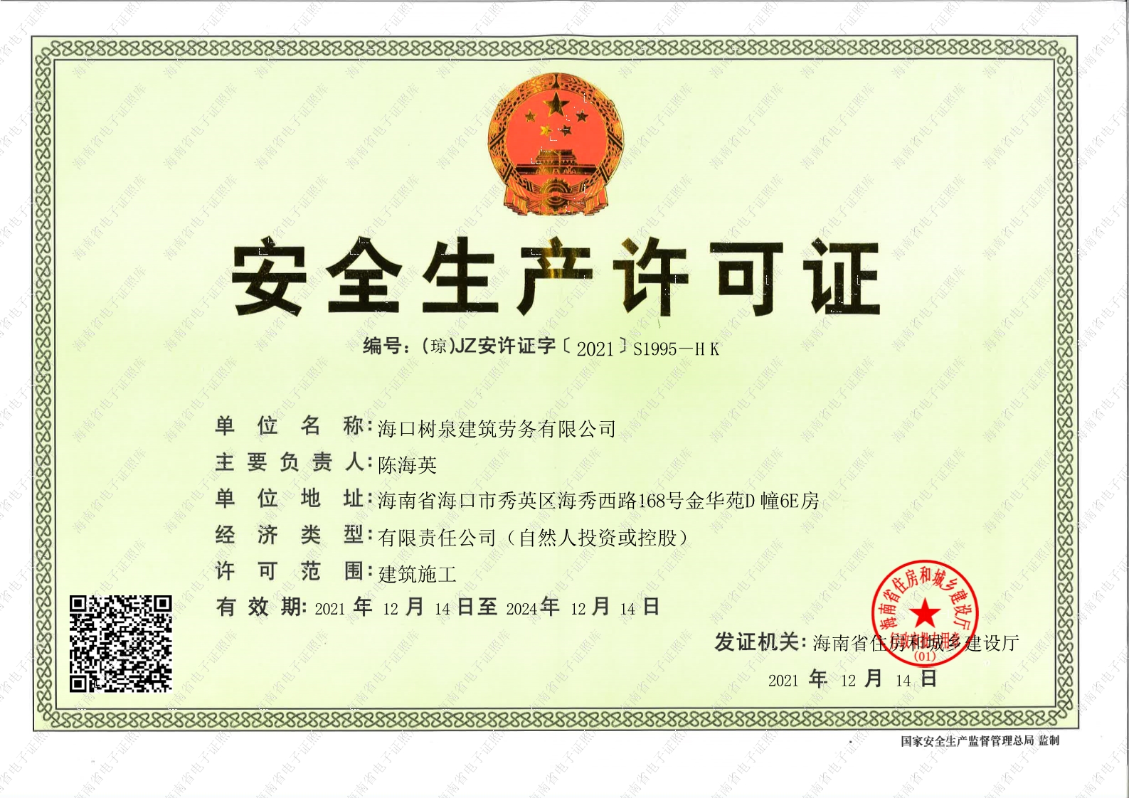 海口樹泉建筑勞務有限公司成立于2011年,公司位于海口,其前身是一家專業建筑施工隊,自2004年即開始在海南從事建筑勞務施工。自成立至今,公司已經擁有一支科學管理、質量過硬、能打硬仗,搶工期的專業隊伍。能獨立承擔大中型工業與民用建筑 、室內外裝修、各類機電設備安裝工程。代表工程有海口濱海華庭、三亞時代海岸T01/02/04/05棟高層、合肥東海花園二期、陵水富力灣B區高層、三亞金中海(酒店)、瓊海大印經典花園、海口環球海景大酒店(四星級酒店,在建中)、陵水珍珠大廈(五星酒店)、海口萬達廣場、美蘭機場二期。